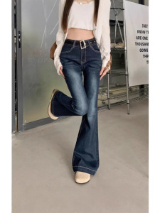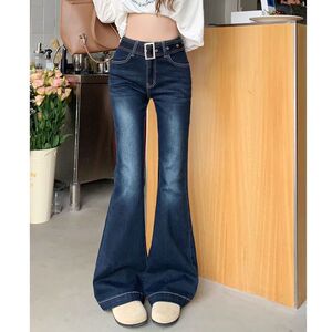 辣妹水洗微喇叭牛仔裤女深蓝色阔腿小个子高腰修身弹力显瘦马蹄裤