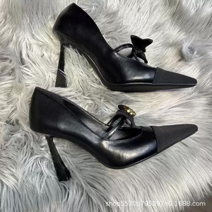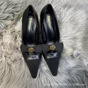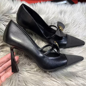 Yujie ハイエンド宴会スプライシングスモールフレグランスハイヒールシューズスティレットヒールスモールスクエアトゥカメリアリボンパンプス