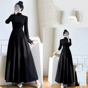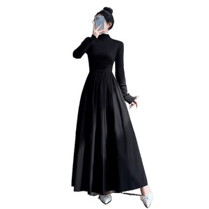 レディドレス、高級フレンチハーフタートルネック、黒の冬ドレス、スリムでエレガント、秋のロングスカート