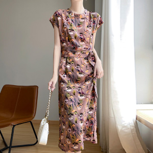 新しい中国風のレトロなアセテートサテン中国風の夏の新しいハーフタートルネックドレス半袖フェミニンなプリント多用途