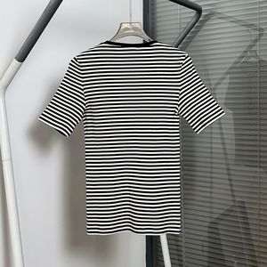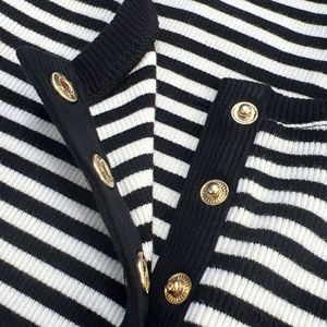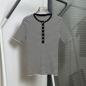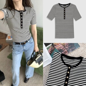 HOUSE25 春夏 ボタン付き スリムフィット 白黒ストライプ ハーフオープン ラウンドネック ニット 半袖 トップス レディース