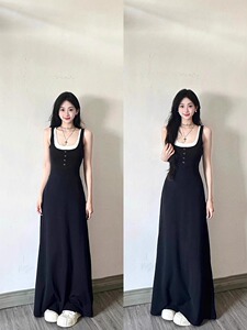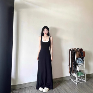 フレンチヘップバーンスタイルの黒のサスペンダードレス、偽のツーピースウエスト痩身、小柄な気質、ノースリーブベストロングスカート