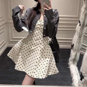 方襟波点ストラップワンピース女性夏の新しい気質は腰を収めて痩せたストラップのデザイン感があるA字の短いスカート
