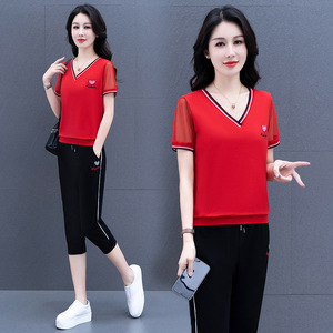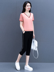 高級夏服カジュアルスーツ女性純綿カジュアル半袖vネック婦人服七分ズボン洋気スポーツウェア二点セット