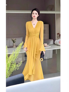 2025 新しいスタイルの社交界の女性の V ネックドレープドレスイブニングドレスハイエンドの女性の宴会気質ヒップスカート