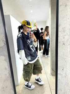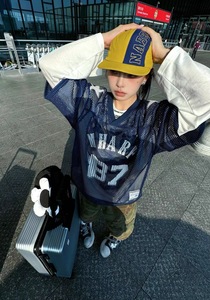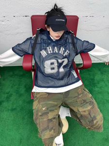夏アメリカンネイビーブルー87ラージメッシュジャージアメリカンストリートレトロプリントジャージ半袖Tシャツ男性と女性の夏