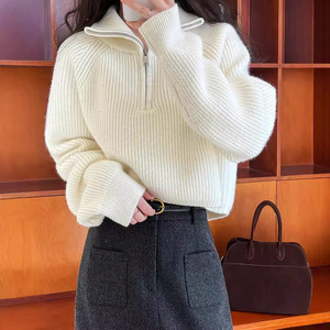 デザインセンスのあるニッチなハーフタートルネックジッパー付きレッドニットセーター、女性用ショートスタイル、秋冬レディースハイウエストルーズソフトワックスセーター
