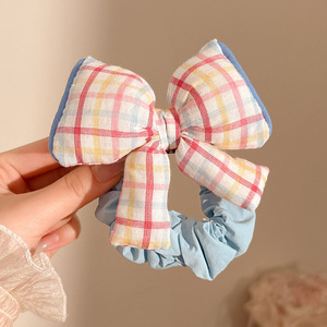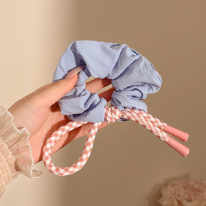 1#ブルーチェック柄ステッチ子猫大腸ヘアゴム-12cm