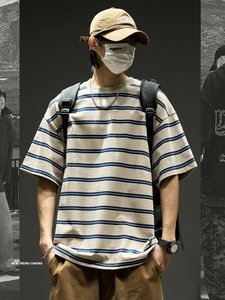 ストライプ Tシャツ メンズ 2025 新しいアメリカンファッションブランド ピュアラウンドネック 半袖 ルーズ カジュアル 香港スタイル 半袖 インサマー