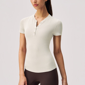 ルル夏の新しい女性のヘンリーシャツスポーツ半袖ヨガトップ弾性スリムフィット吸湿発散性ランニング