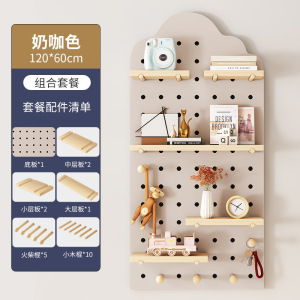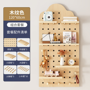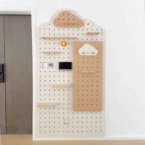 木の穴の板の扉の後の玄関の壁の物置棚の子供の机の背景の壁の形の展示棚の掛け板の仕切り板