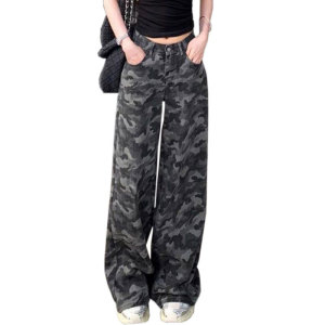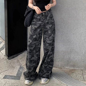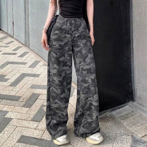 大码美式复古松弛感迷彩牛仔裤女夏季新款做旧宽松直筒拖地长裤子
