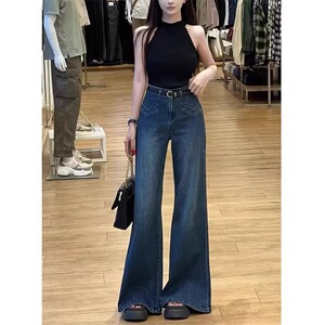 春夏の女性用プラスサイズダークブルーハイストリートデザインマイクロフレアジーンズハイウエストスリムワイドレッグフロアレングスパンツ