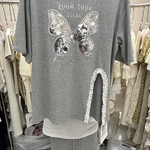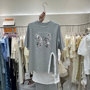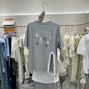 【オリジナル品質】特大サイズ 150kg バタフライ スパンコール スプリット レース デザイン 半袖 Tシャツ レディース ゆったり