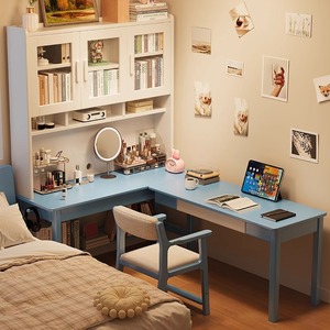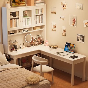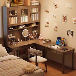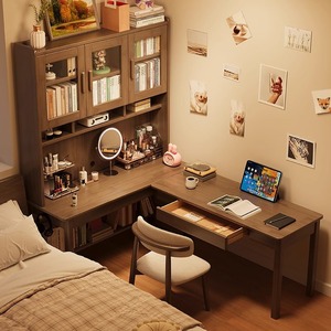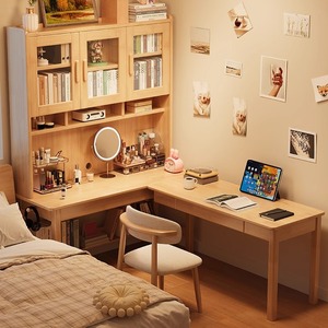 無垢材コーナーデスク本棚一体型本棚組み合わせ学生L字型学習机寝室壁コーナーコンピュータテーブル