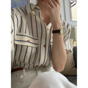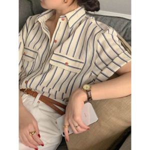 夏季新款法式复古韩系设计感小众口袋条纹短袖衬衫防