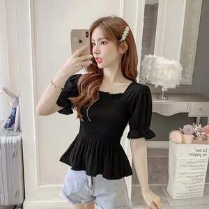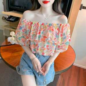 夏の新しいデザインバブル半袖ニッチトップミントワンショルダー甘い花柄シフォンシャツ女性用
