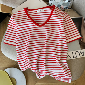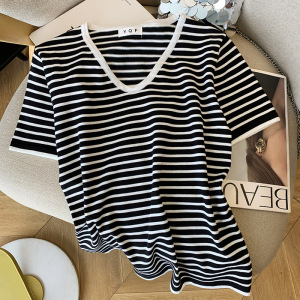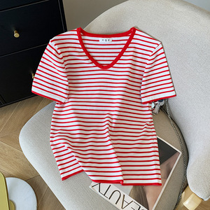 リアルショット既製婦人服夏の新しい韓国スタイル V ネックストライプ半袖 T シャツ西洋スタイルアイスシルクセータートップ女性用