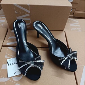 ZA夏季2025新款一字水钻蝴蝶结饰高跟鞋女露趾搭扣法式方头凉拖鞋
