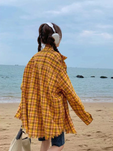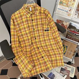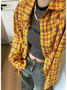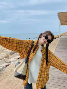 2025 春の新レトロシックな黄色のチェック柄シャツジャケット女性のオーバーサイズルーズスタイル怠惰なスタイルのシャツ