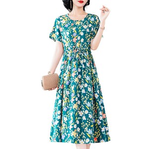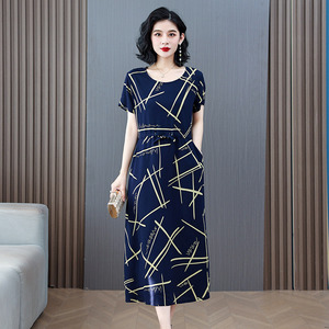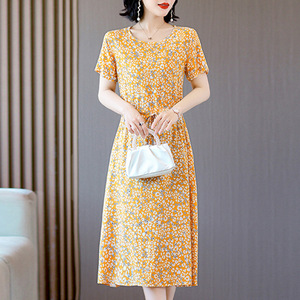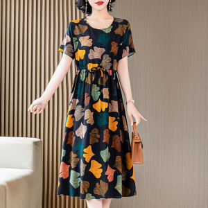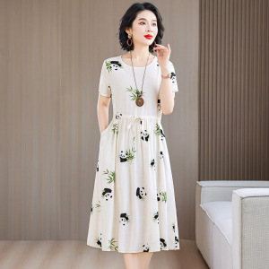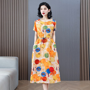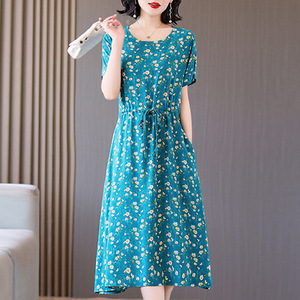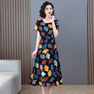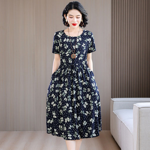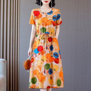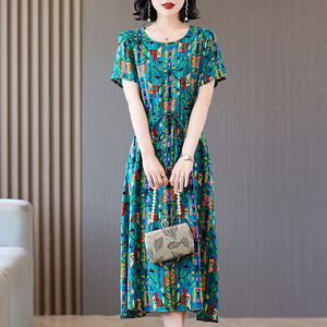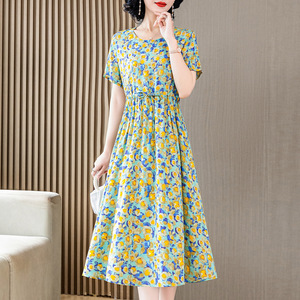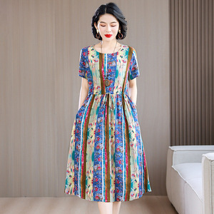 2025新款气质棉绸连衣裙女夏季时尚收腰显瘦中长款人造棉印花裙子