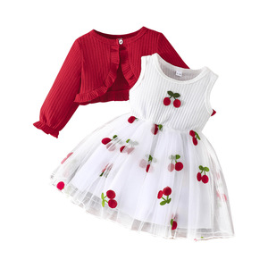 2025新型長袖カーディガンの小さいマントとさくらんぼの図案の多層の網の紗のスカートのスーツのクロスボーダーの源のメーカー