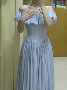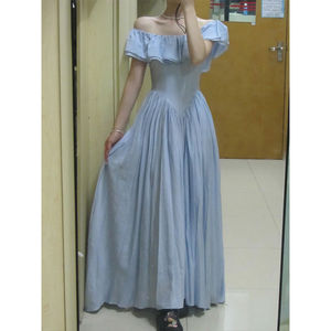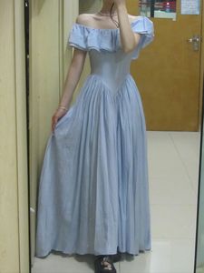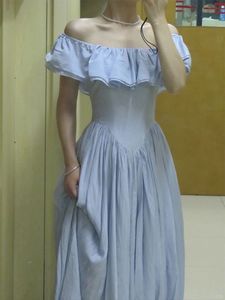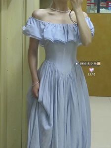 ブルーフリルスリーブワンショルダードレス女性の夏の 2025 新しいフレンチスタイルウエストロングスカート海辺の休暇ドレス