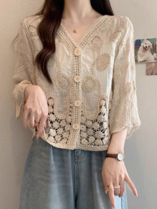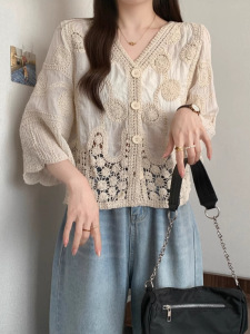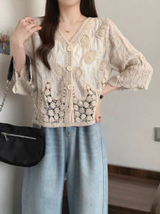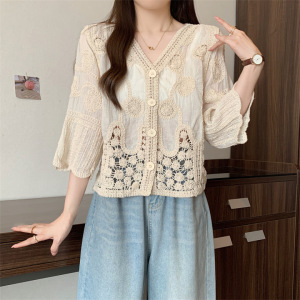 波西米亚风镂空七分袖女初夏新款大码胖mm遮肚外搭开衫上衣女 009