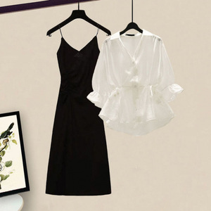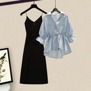 女性用サマースーツ 2025 新しい大きいサイズの女性のウエスト痩身カバーシャツサスペンダードレスツーピーストレンディセット