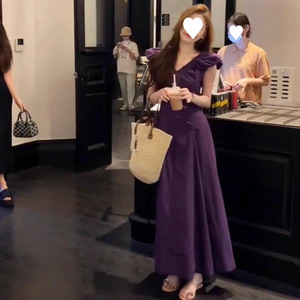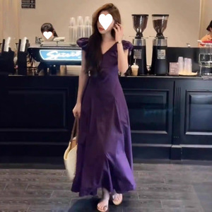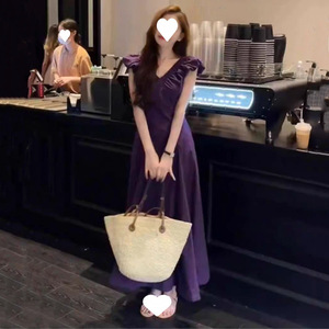 大きいサイズの太ったmmフランスの紫色の小さい飛袖vネックのしわは腰のワンピースの女性の夏の気質の優雅な長いスカートの200斤を収めます。