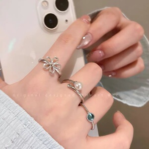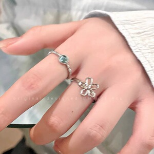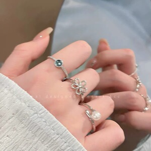 ブルークリスタルプレーンパールオープンリングレディースシンプルニッチデザインフラワーリング親友重ね付け人差し指リング
