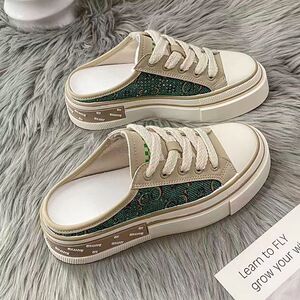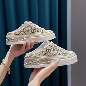 包頭ハーフスリッポンレディース夏アウターシューズ 2025 春夏新作カジュアルスリッポンレイジー厚底白キャンバスシューズ