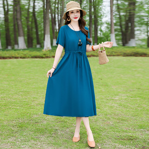 夏の新型綿のワンピースの半袖のフランスのひもの気質の長いスカートのピンクは腰を収めてやせているワンピースを現します。