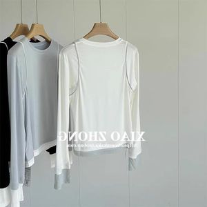 李火火薄款春圆领拼接撞色T恤女假两件内搭打底衫休闲长袖上衣潮