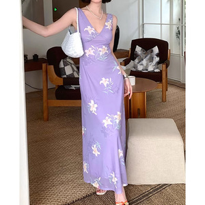 ガーゼフレンチレトロ夏紫サスペンダープリントドレスロングホリデースカート2025夏の新スタイル