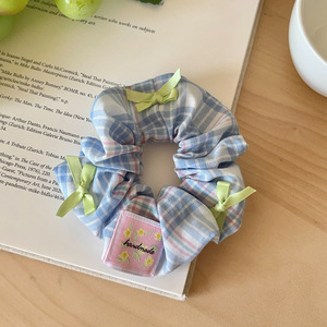 1#ブルーのチェック柄レースのヘアゴム