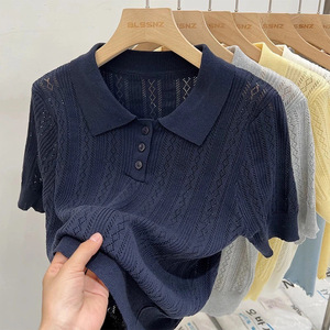 シャツラペル中空半袖セーターレディース2025年夏新スタイルユニークでニッチな半袖イエロートップ