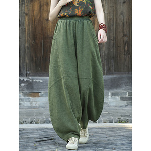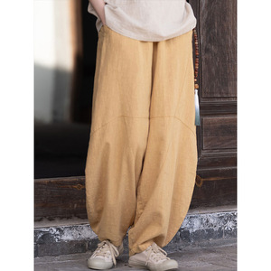 暖色系の黄色(長袖)トップス+麻色のパンツ