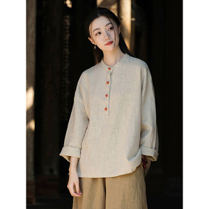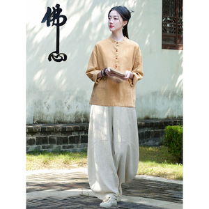 女性用在家服、中国風婦人服、綿麻ボタン付きトップス、禅服、中国風仏教禅無地スーツ