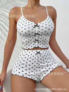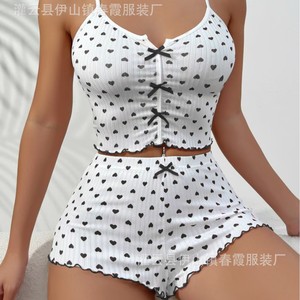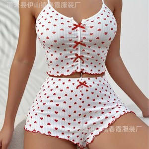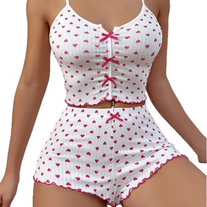 国境を越えた新作、ハート型の蝶とピンクとブルーの唇プリントが特徴の、コントラストカラーのホームウェア、ストライプ柄のサスペンダーパジャマセット