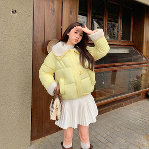 韓国風キャンディーカラーの年齢を軽減する小柄な人向けの2025年冬スプライシング二層ラージラペルホーンボタンショートコットンコート学生向け