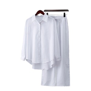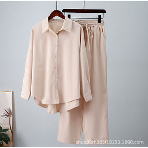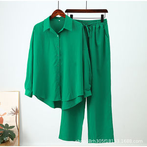 2025ファッション欧米秋冬新型ゆるい弾力しわ長袖シャツ広脚ズボンカジュアルスーツ女性2点セット