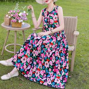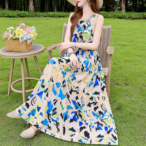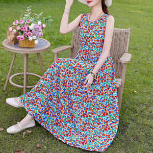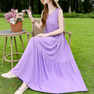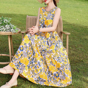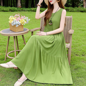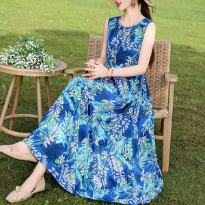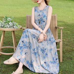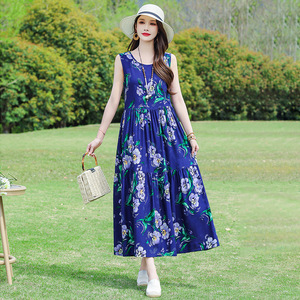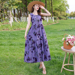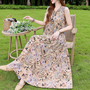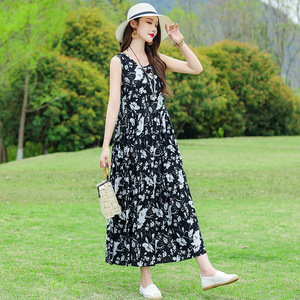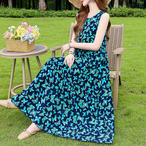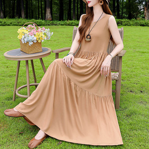 夏の綿のシルクのワンピースの新型の外は若いタイプのストラップビーチのスカートの女性の袖なしの休暇のスカートの長いスカートを着ます。