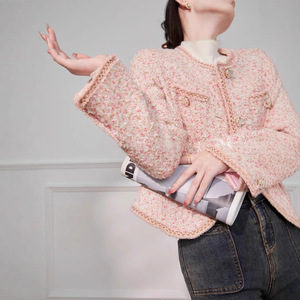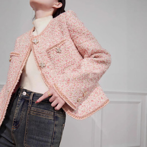 春先の新作ツイード韓国風ピンクショートコートレディース春秋高級シックトップス
