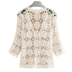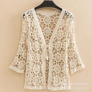 春夏薄手フック柄中空ひまわりジャケットレディースレースアップVネック七分袖ショール万能ルーズトップ