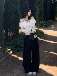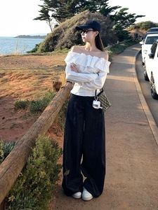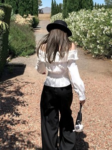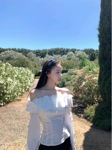 Gardenia 纯欲小众荷叶边一字肩长袖衬衫女减龄气质修身白色上衣