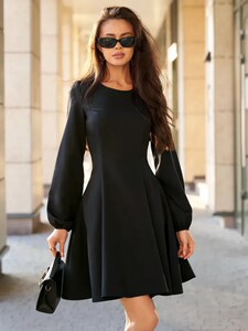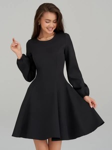 クロスボーダーヨーロッパとアメリカの服アマゾンの新しいラウンドネックウエスト痩身Aラインスカート黒気質長袖ドレス女性用