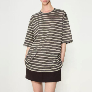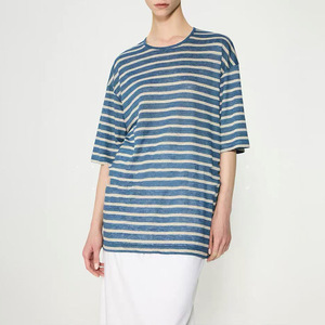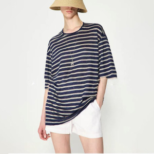 口コミB入夏新作スリムで軽いリネン快適ストライプゆったり怠惰な日焼け止め半袖トップスTシャツ女性用