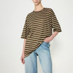 ブラウン、ベージュ、ホワイトのストライプ半袖
