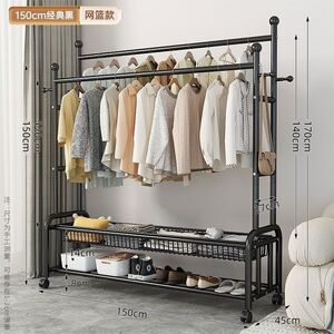 極厚洋服ラック、寝室用洋服ラック、床置き縦型物干しラック、多機能厚みのあるコートラック、ダブルロッド